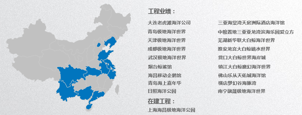 大連凱晨已完成了大連老虎灘極地海洋世界、青島極地海洋世界、青島鯨豚館、成都極地海洋世界、天津極地海洋世界、煙臺鯨鯊館、武漢極地海洋世界等項(xiàng)目維生系統(tǒng)設(shè)計(jì)建造任務(wù)。